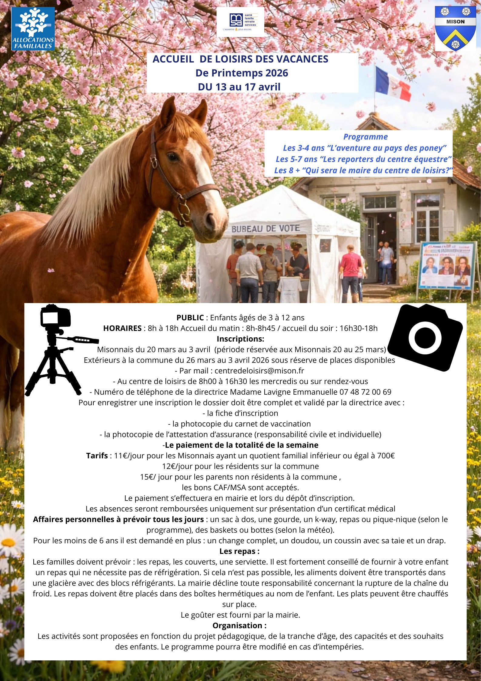 Le centre de loisirs de Mison arrive au galop pour vous présenter ses 3 programmes adaptés à chaque tranche d’âge pour les vacances d’avril , rempli de soleil, de bonne humeur et d’activités variées pour vos enfants ! Vous trouverez tous les détails pratiques et les informations nécessaires dans les documents joints à ce mail.